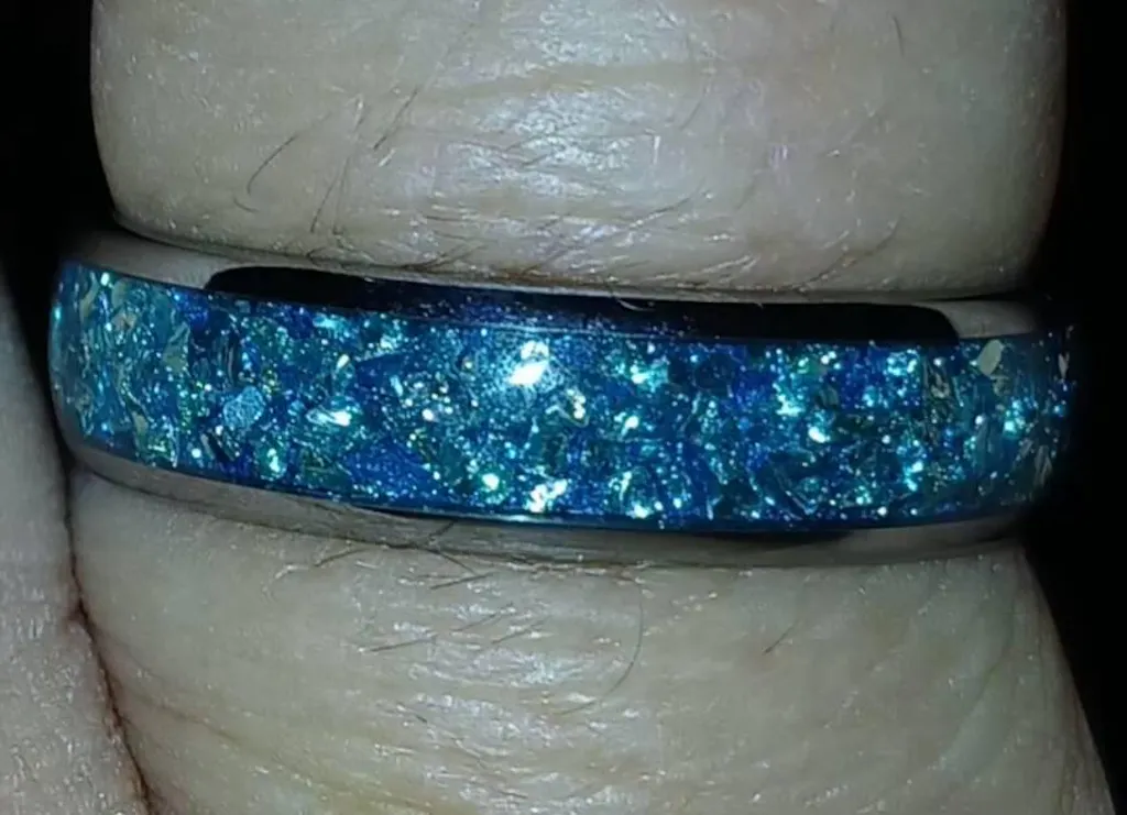 Crushed Aquamarine Inlay: The centerpiece of this ring is the breathtaking inlay of crushed aquamarine, a gemstone revered for its serene blue hues and connection to tranquility and harmony.