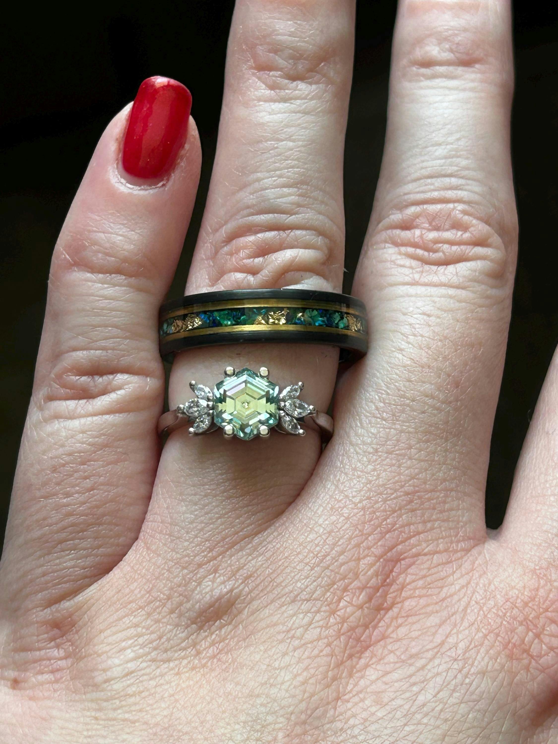 This tungsten ring with green opals and gold leaf is perfect for any occasion, whether it's a formal event or a casual day out. It's a great gift option for that special someone who appreciates unique and high-quality jewelry.