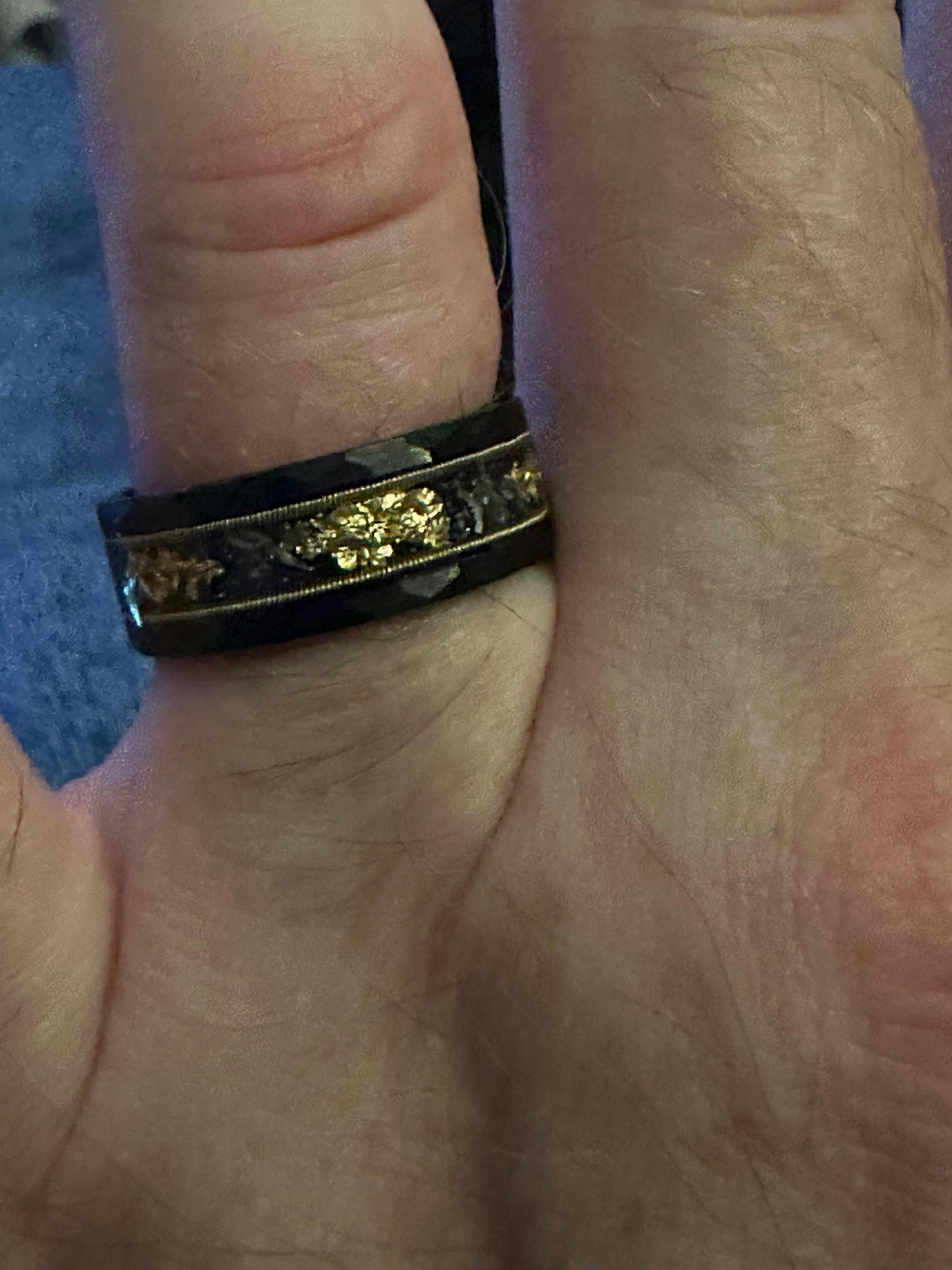 This ring is 8mm wide and is made out of Tungsten! The wedding band is inlayed with guitar string, meteorite, and gold leaf. This ring is perfect for guitar players, space enthusiasts, or just someone that wants a unique wedding Band. The ring can also be used as a promise ring, anniversary ring, or a great gift!