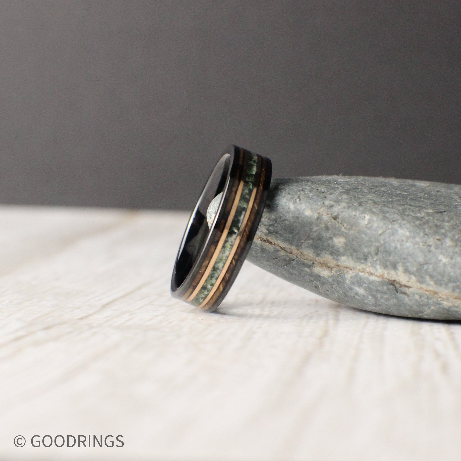 Material: Burnt Whiskey Barrel, Moss Agate, Tungsten, 18K Rose Gold