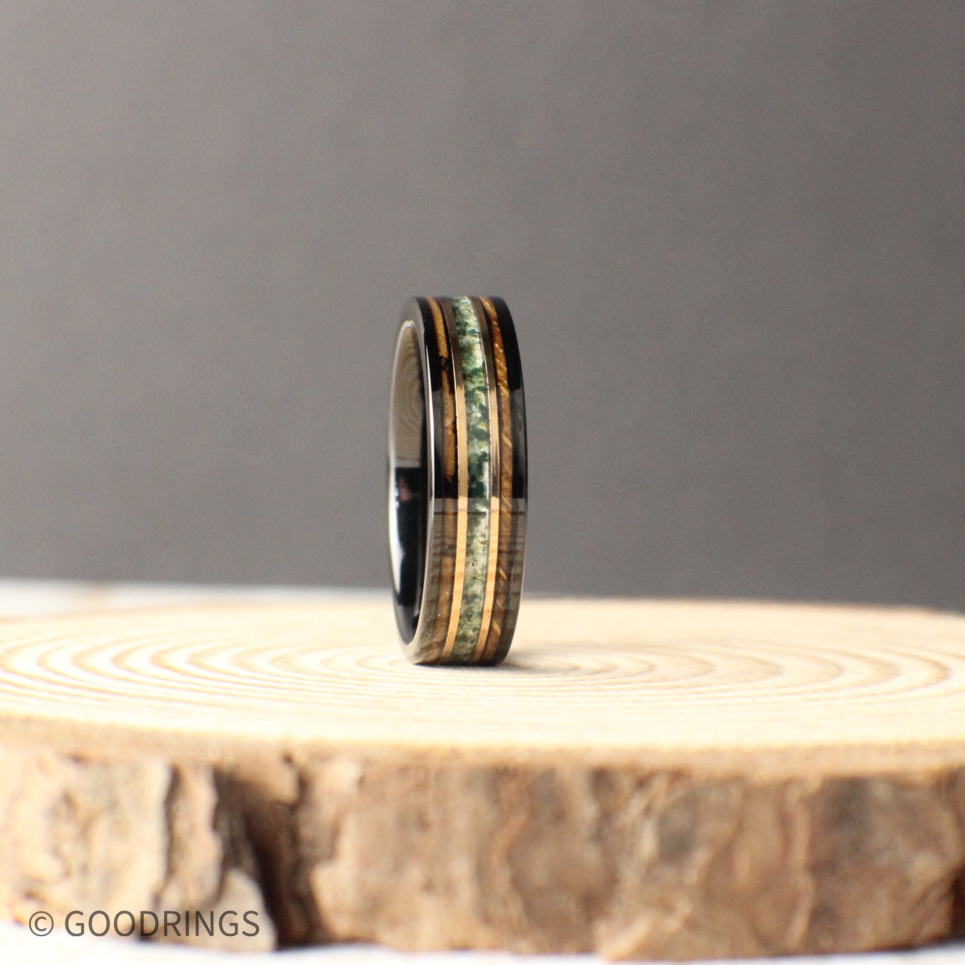 This moss agate men's wedding band has the perfect combination of brown, gold and green colors. The ring is made out of durable tungsten and inlayed with burnt whiskey barrel and crushed moss agate. Separating the two materials is a line of 18K rose gold.