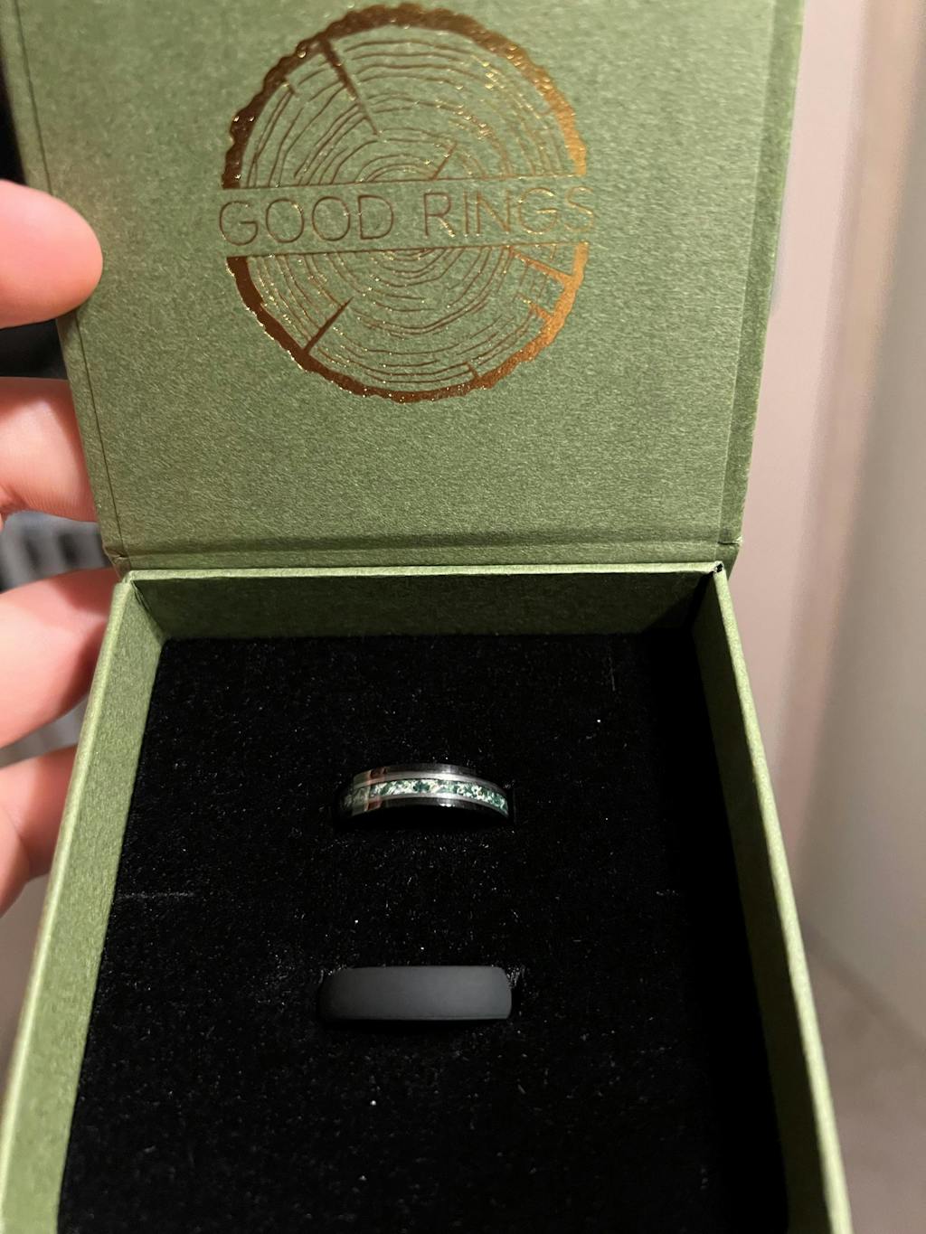 Amazing quality ring to match my fiancé's engagement ring. I'm glad it came with a black silicone ring too because that is the color I wanted. Came in a really nice box too!