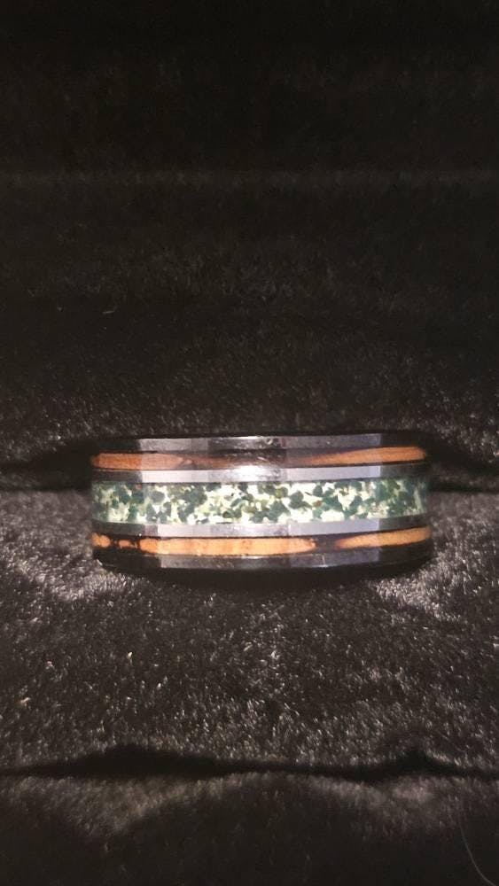 Inlay Materials: This band boasts a stunning inlay of burnt whiskey barrel wood and crushed moss agate, carefully crafted to create a striking contrast that catches the eye.