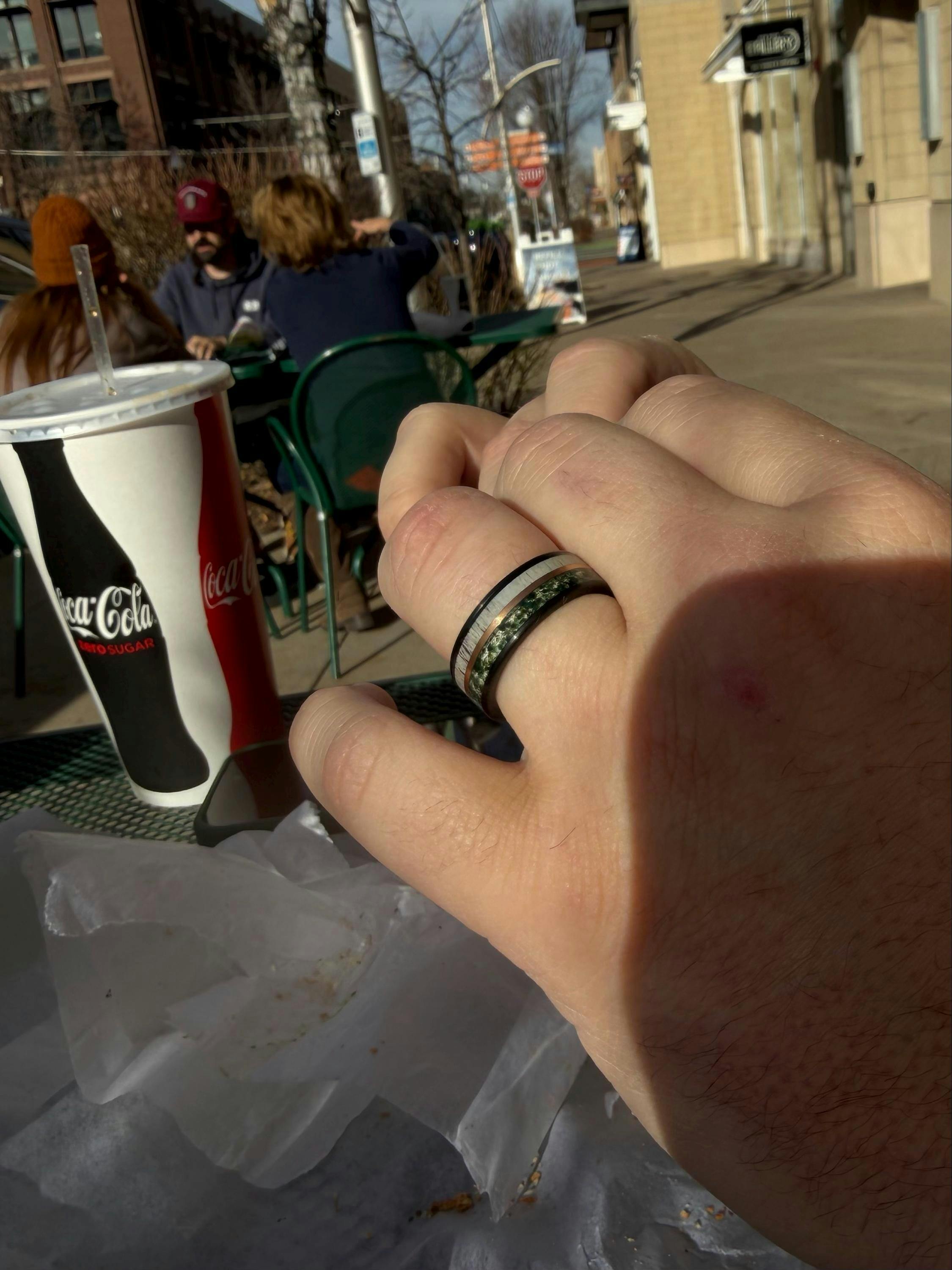I bought this ring for my fiance as I felt he deserved something pretty too 😜 It is gorgeous and now we both have rings with moss agate. He's a hunter so he loves the antler as well. Unique and worth every penny!