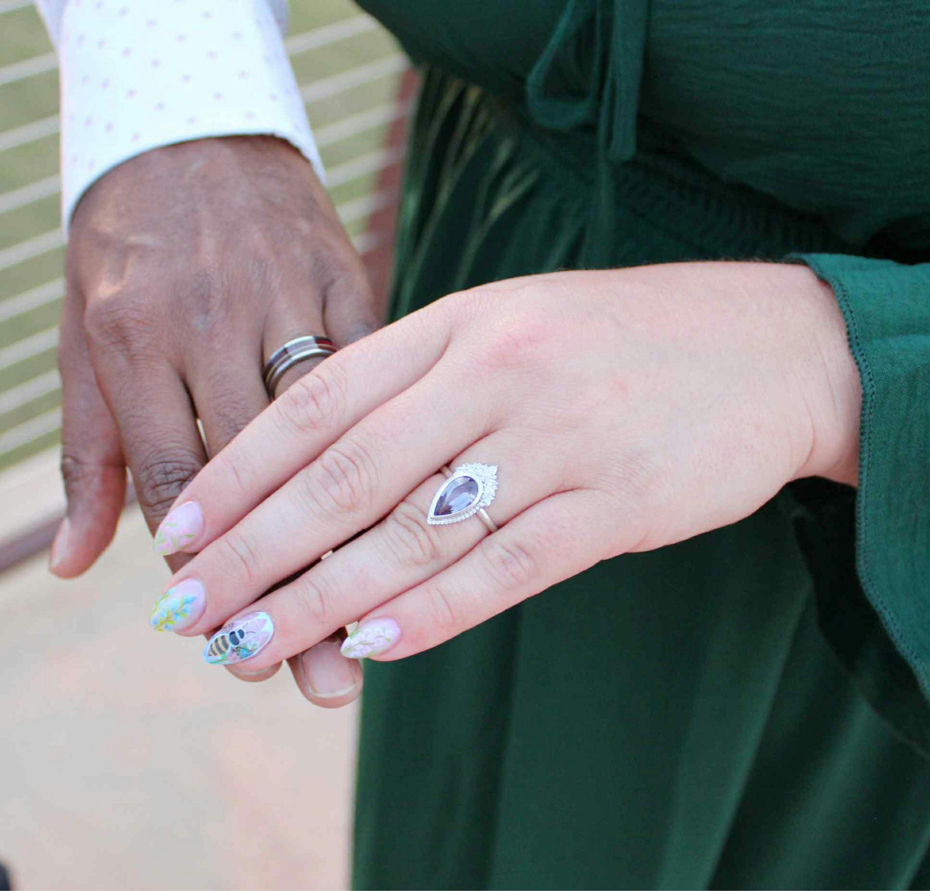 Adding a touch of warmth and natural beauty, the inlay features Purple Heart wood, a stunning hardwood known for its rich, deep purple hues. This unique choice of wood not only adds a pop of color to the design but also symbolizes resilience and strength, reflecting the lasting nature of your commitment.